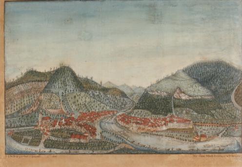 Wolfach zwischen den Bergen mit jeweils einem Floß