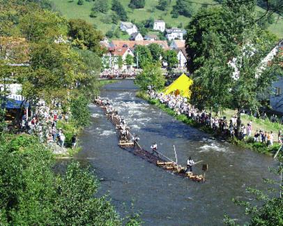 Zu diesem Jubiläumsfest wurde dann ein über 100 m langes Floß nach historischen Vor-bildern gebaut. Das Wasser der Kinzig und der Einsatz der Stauwehre erlaubten eine Fahrt durch den Stadtkern von Wolfach.
